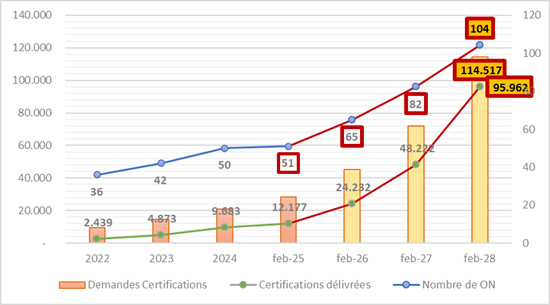 Risultati delle proiezioni: se si arriva veramente a 104 ON nel 2028 e se si raggiunge anche il numero di certificati emessi, significa che ogni ON avrà 919 certificati da emettere. È fattibile?